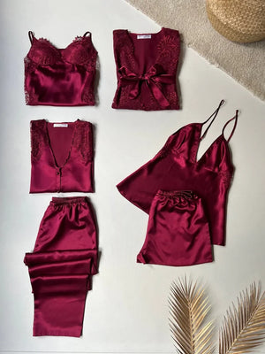 6Pcs Slit Turkish Style Nighty Set Maroon