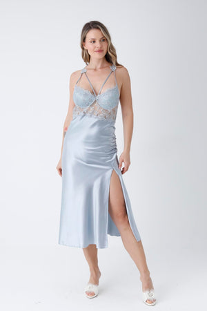 Mist 6 Piece Long Slit Satin Nightgown Dressing Gown Set
